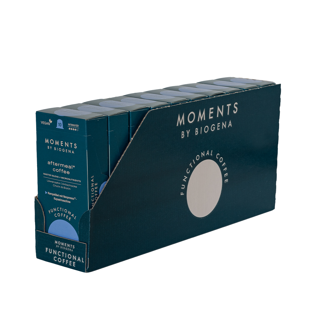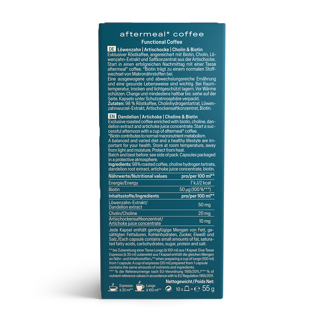 Exklusive Kaffee-Röstung aus Italien, angereichert mit Biotin, Cholin, Löwenzahn-Extrakt und Saftkonzentrat aus der Artischocke. Start in einen erfolgreichen Nachmittag mit einer Tasse aftermeal* coffee.